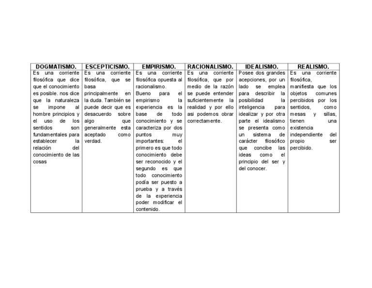 Cuadro Comparativo De Dogmatismo Escepticismo Empirismo Racionalismo Idealismo Y Realismo Pdf Racionalismo Empirismo